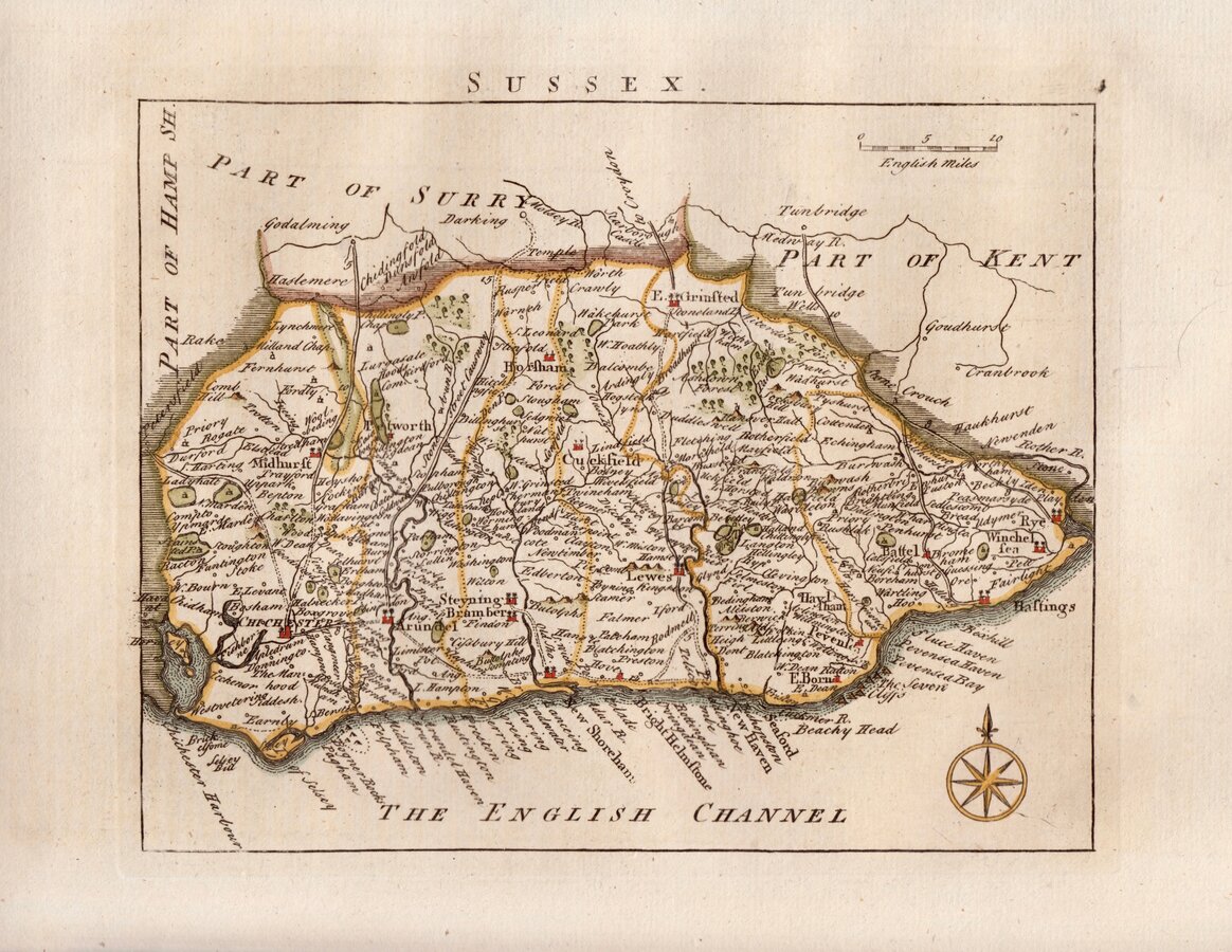 This hand coloured example of the map of Sussex, with the plate number erased and scratch near the compass rose, was published in England Displayed...London, 1769.