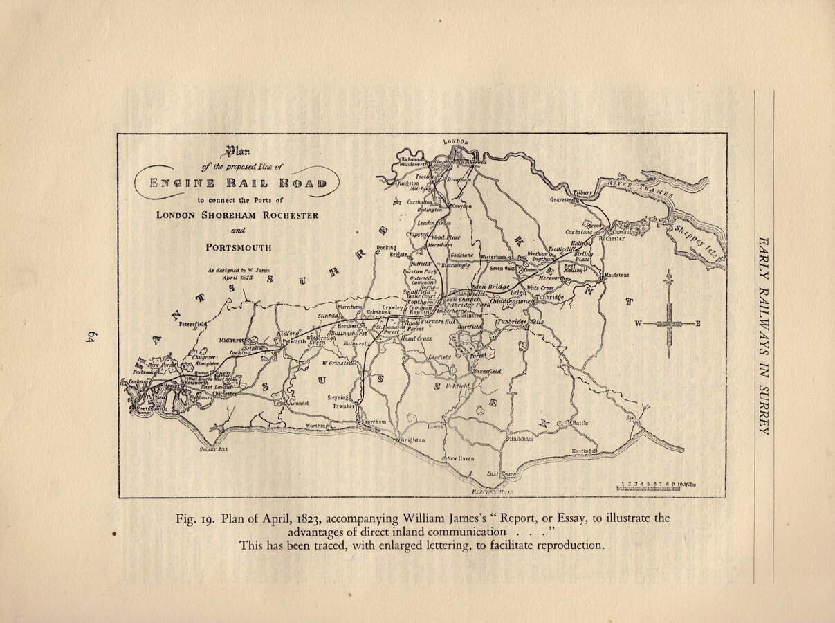 of the Proposed ENGINE RAIL ROAD  to connect the Parts of LONDON SHOREHAM ROCHESTER adn PORTSMOUTH As designed by W. James April 1823