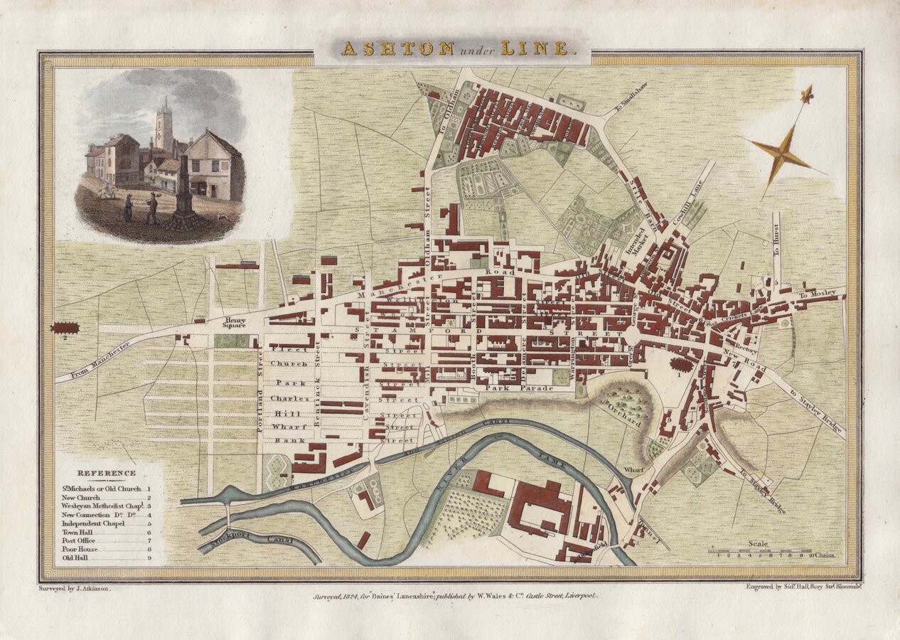 Very good exampe in fine hand colour of an uncommon plan showing Ashton-under-Lyne in the first quarter of the 19th century.