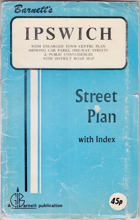 Barnett's IPSWICH WITH ENLARGED TOWN CENTRE PLAN SHOWING CAR PARKS, ONE-WAY STREETS & PUBLIC CONVENIENCES WITH DISTRICT ROAD MAP Street Plan with Index A GIBarnett publication 45p