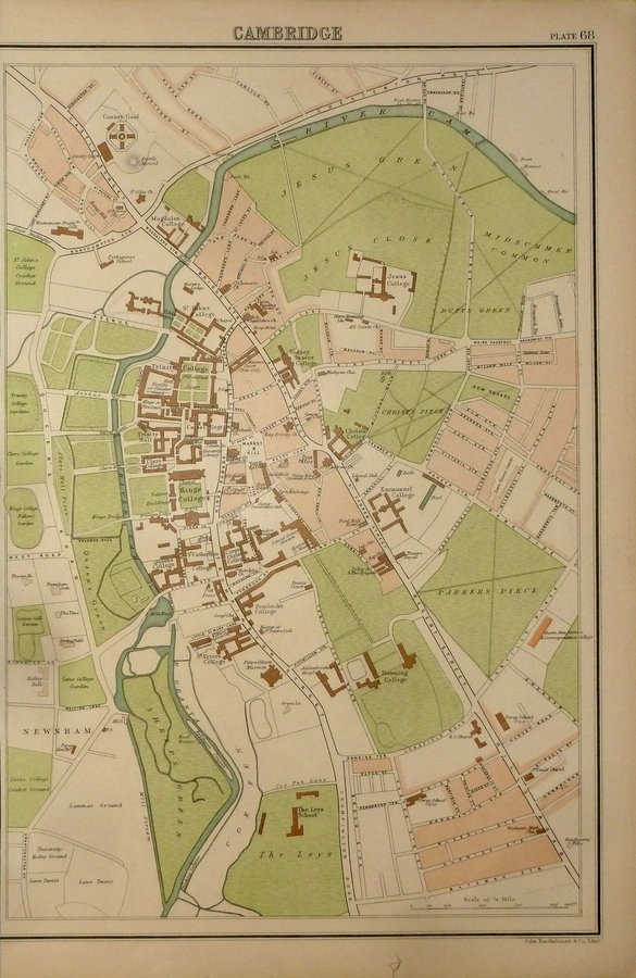 Colour printed lithograph published by John Bartholomew in his Royal Atlas of England and Wales in 1898. The Cambridge and Oxford town plans were printed on the same page and this Cambridge plan has been separated from Oxford with subsequent loss of left margin.