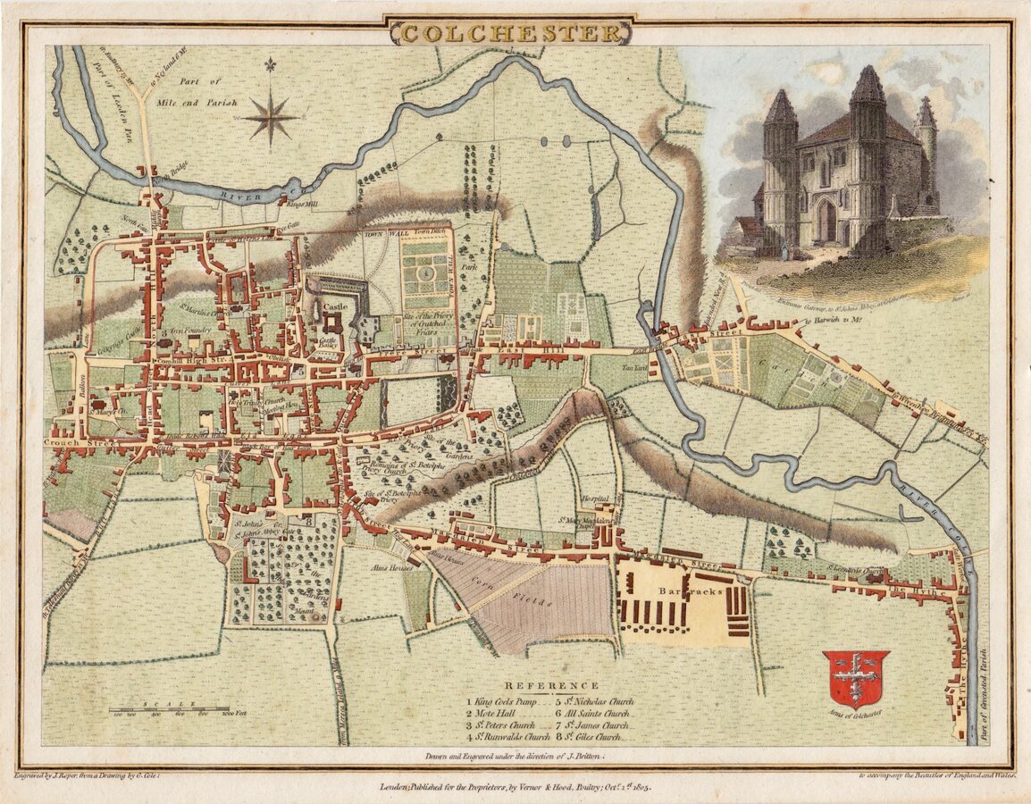 Small margins but a fine hand coloured town plan of Colchester with the arms of Colchester and a vignette of The Entrance Gateway to St. John's Abbey.