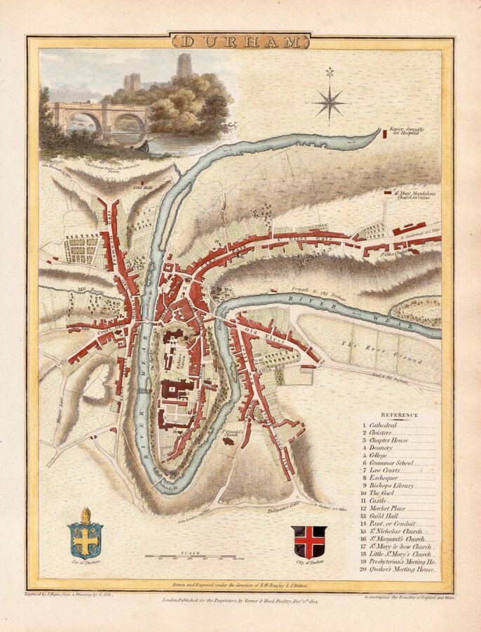 Very good hand coloured example of the town plan of Durham with the arms of the See and the City of Durham and a vignette of The Prebends Bridge and Cathedral.