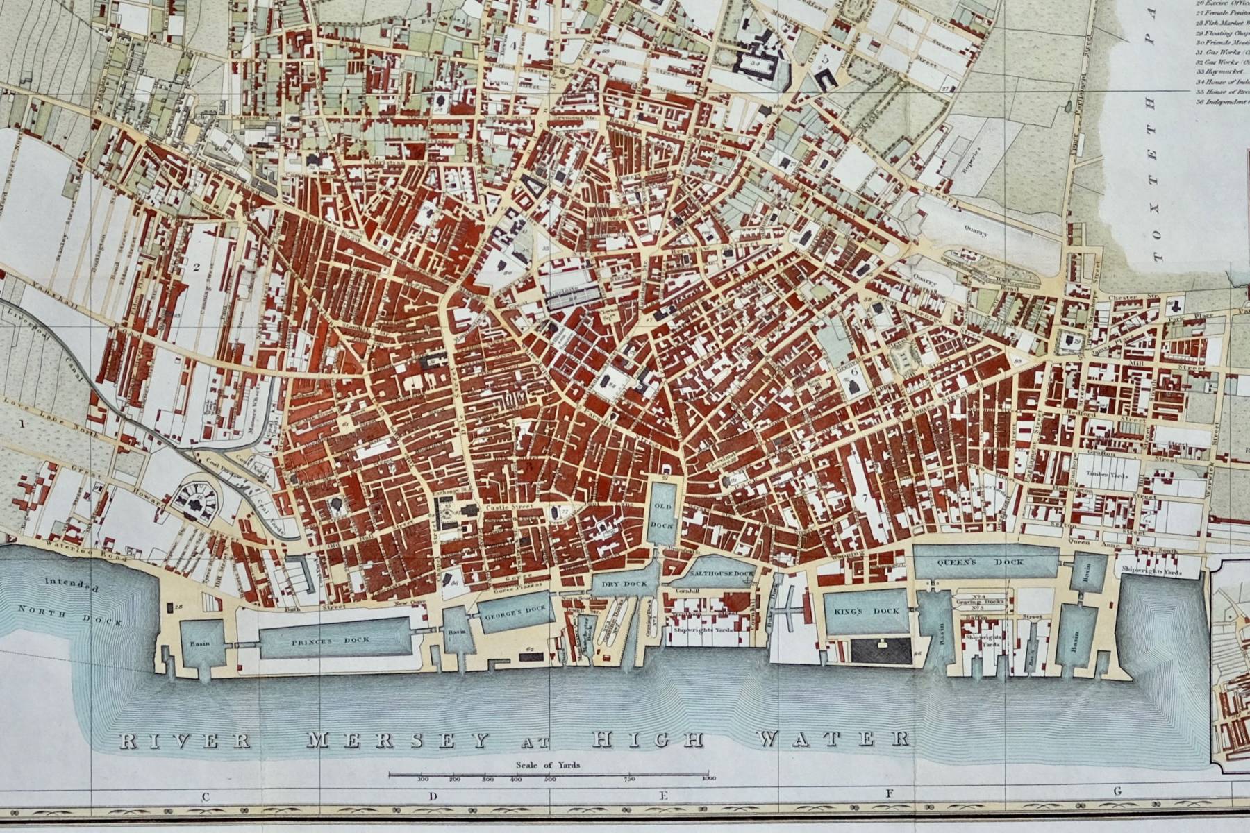 Finely engraved plan by Neele and Son from a survey by William Swire flanked by a vignette of the Town Hall and Exchange Buildings, The Arms, motto, crest and supporters (Neptune and a Merman) of Liverpool, Seals of the Trustees of Liverpool Docks, The Corporation of the Liverpool Exchange, and The Corporation of Liverpool, and an inset Plan of Liverpool in 1720.