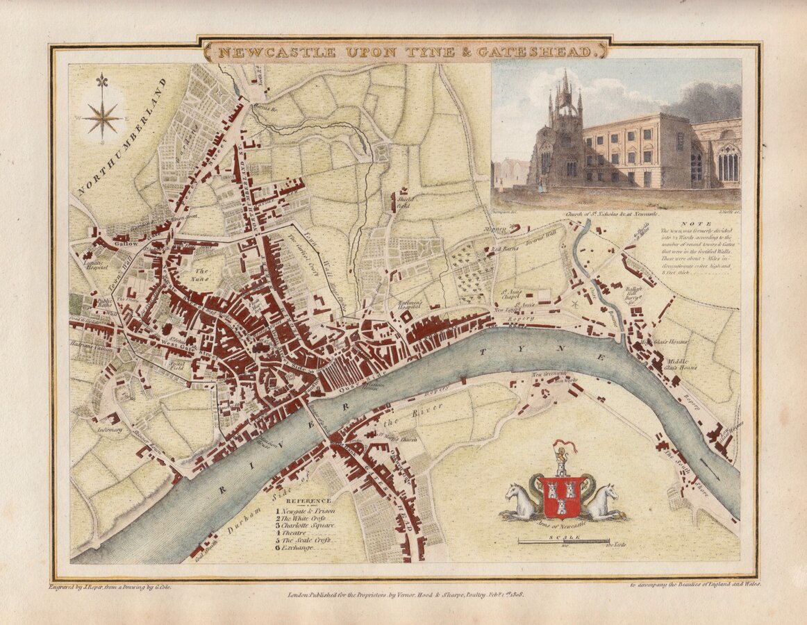Vignette of St. Nicholas Church Newcastle and Arms of Newcastle. Hand coloured.