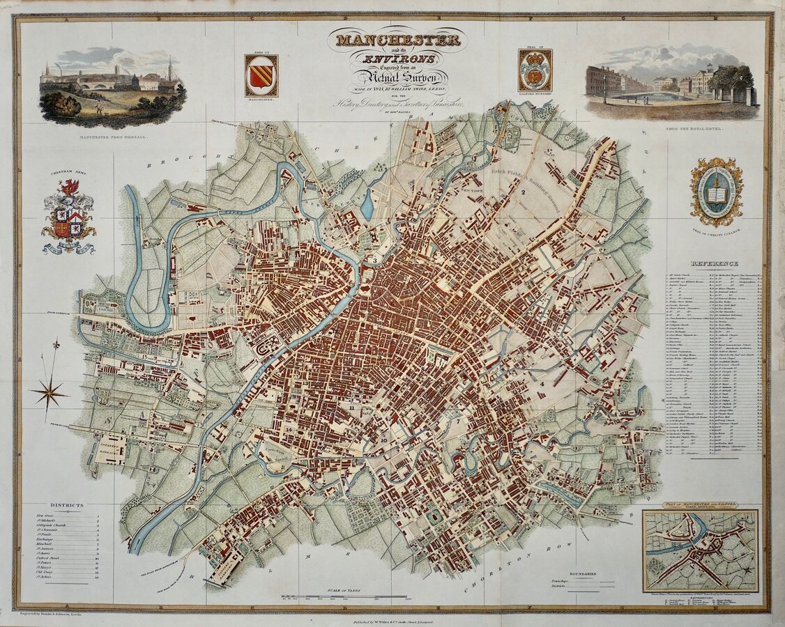 Includes vignettes; "MANCHESTER FROM ORDSALL" and "FROM THE ROYAL HOTEL"Arms of Manchester and Cheetham, Seals of Salford Hundred and Christ's College and inset "PLAN OF MANCHESTR AND SALFORD, TAKEN ABOUT 1650. Drawn from a Plan in the possession of Willm. Yates Esq.r by Jn.o Palmer, Architect, 1822."