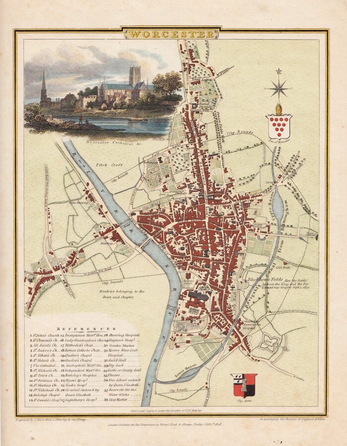 Fine hand coloured example of the town plan of Worcester with the arms of the See and City of Worcester and vignette of Worcester Cathedral.