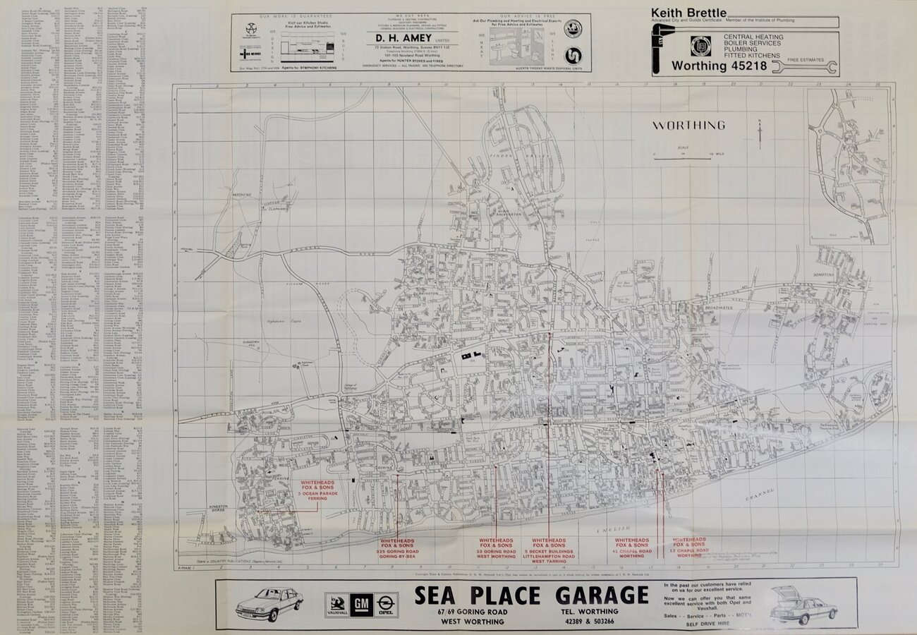 Folding town plan 62x42 printed on glossy paper with index to places left margin and verso and 23 advertisements for local businesses top, bottom and verso. Locations of Whiteheads Fox & Sons offices overprinted in red.