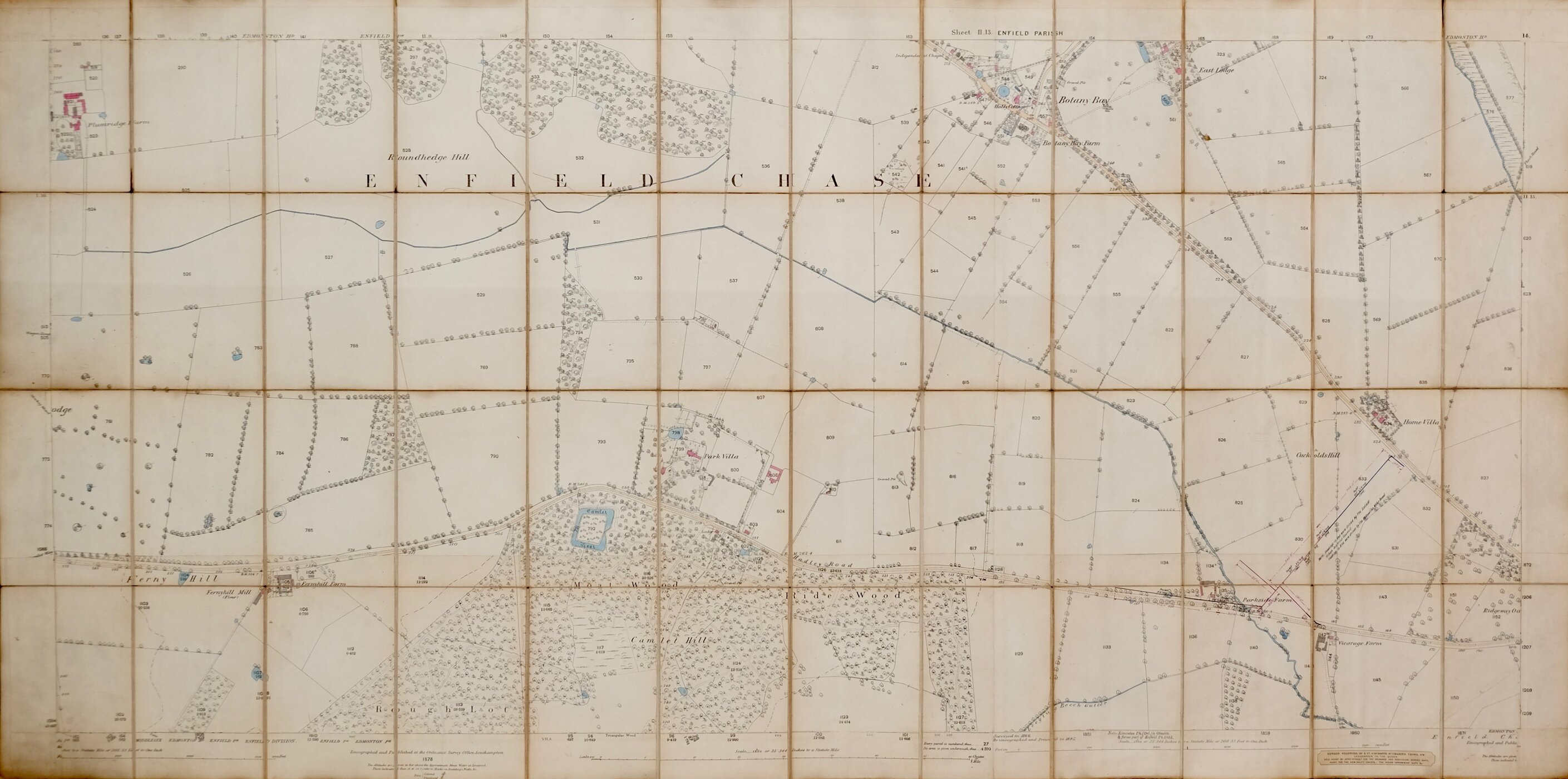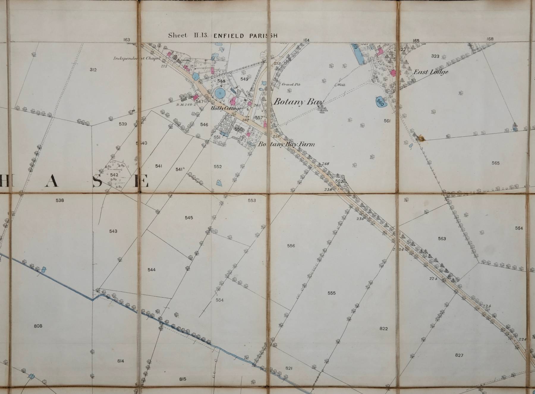 Composite sheet showing Enfield Chase. Shows Ferny Hill and Hadley Road, The Ridgeway to Botany Bay. Properties include: Fernyhill Mill, Fernyhill Farm, Park Villa, Parkside Farm, Vicarage Farm, Home Villa, East Lodge, Holly Cottage, Botany Bay Farm, Plumridge Farm.