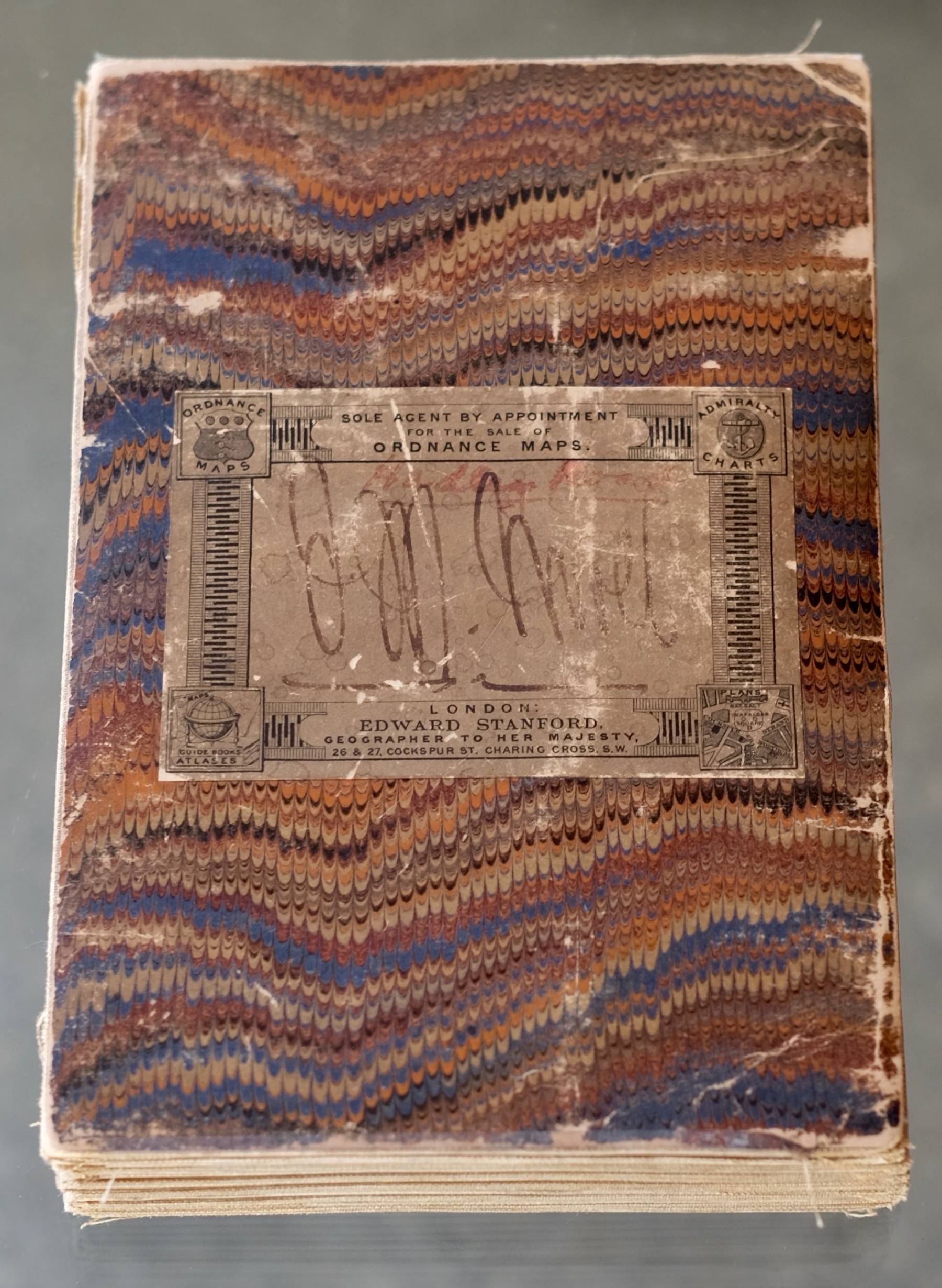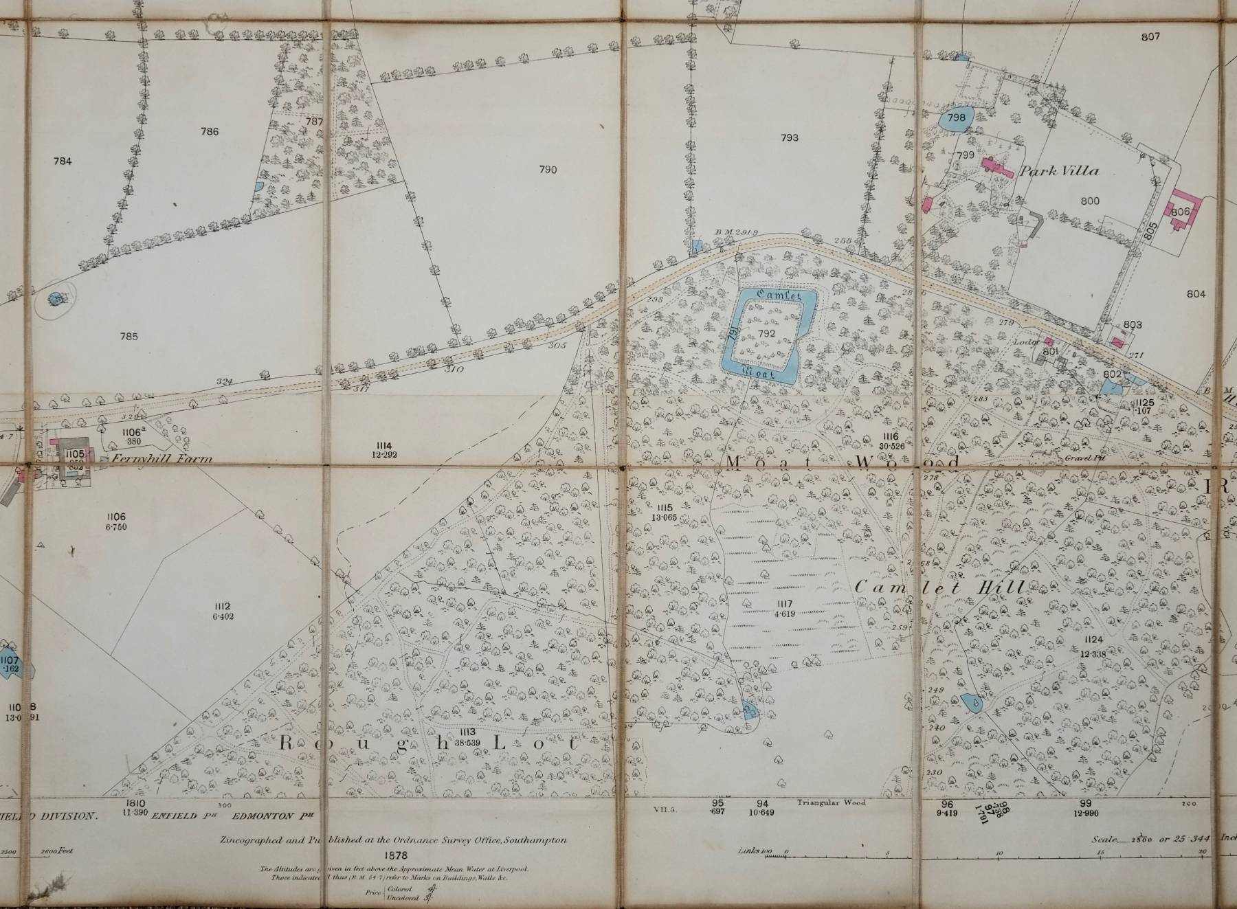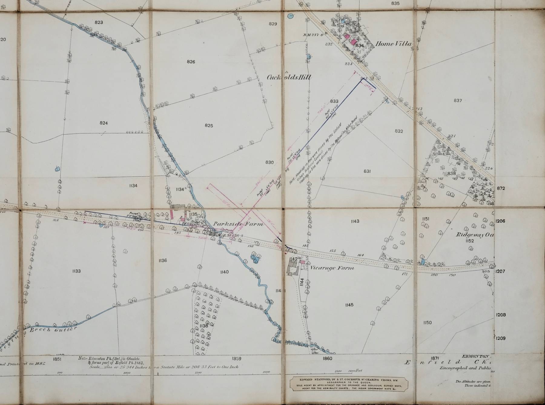 Segmented in 48 sections and pasted on linen with hand colour to buildings, water and roads. Covers rubbed with Edward Stanford label. No box. Some manuscript additions at Parkside Farm. Browning at segment edges and linen backing fragile at folds with some splitting re-inforced with archival mending tissue on reverse.