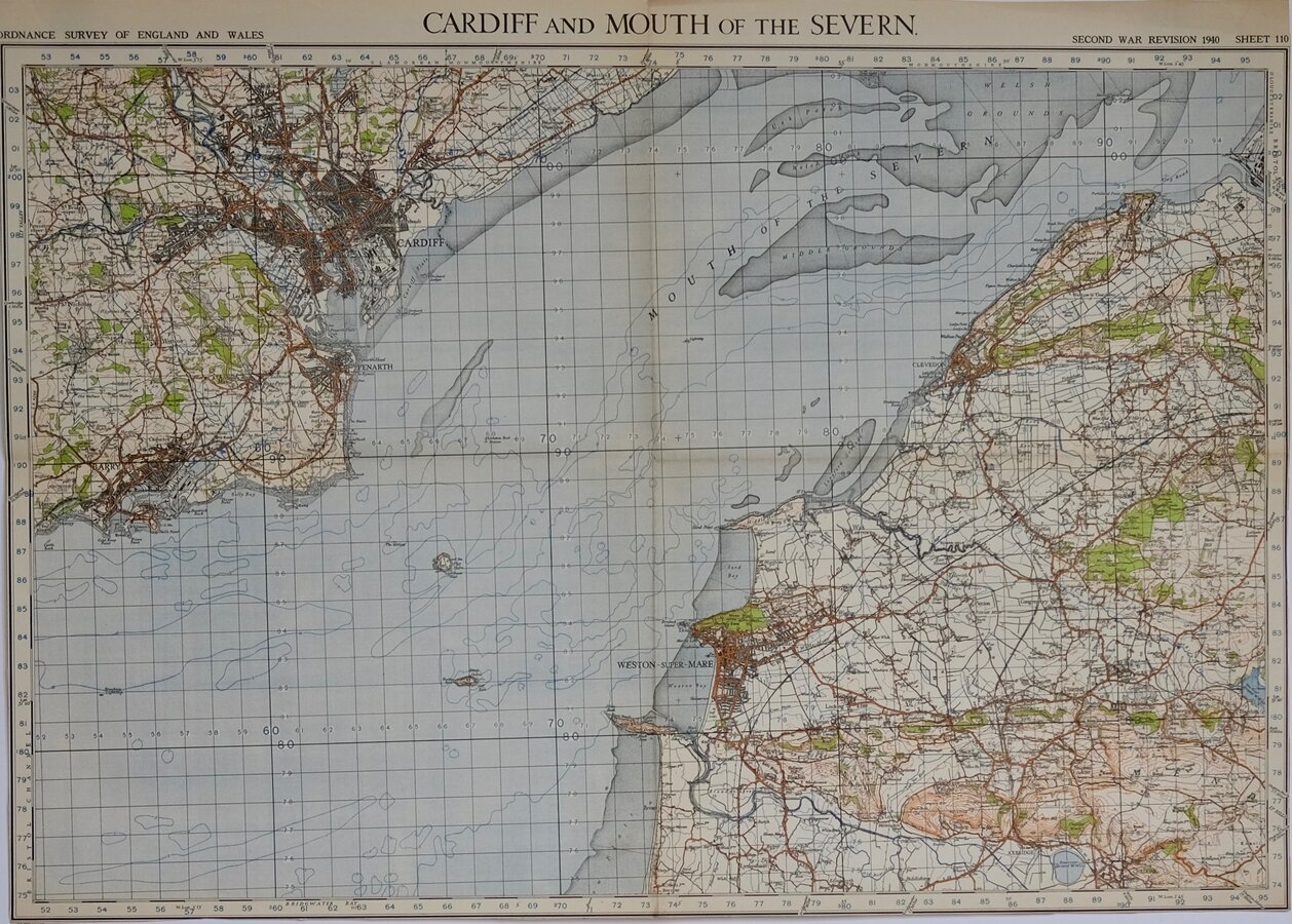 CARDIFF AND MOUTH OF THE SEVERN.ORDNANCE SURVEY OF ENGALND AND WALES.SECOND WAR REVISION 1940 SHEEET 110Paper. Folded. Trimmed to margins.