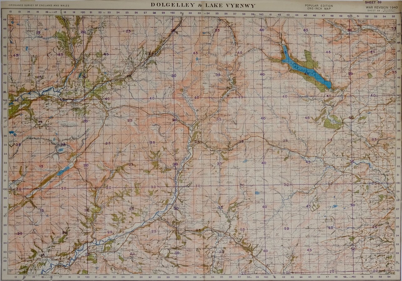 DOLGELLEY & LAKE VYRNWY ORDNANCE SURVEY OF ENGLAND AND WALES. POPULAR EDITION ONE-INCH MAP WAR REVISION 1940 SHEET 59 (Monmouthshire & Montgomeryshire.) Paper. Folded. Trimmed to margins.