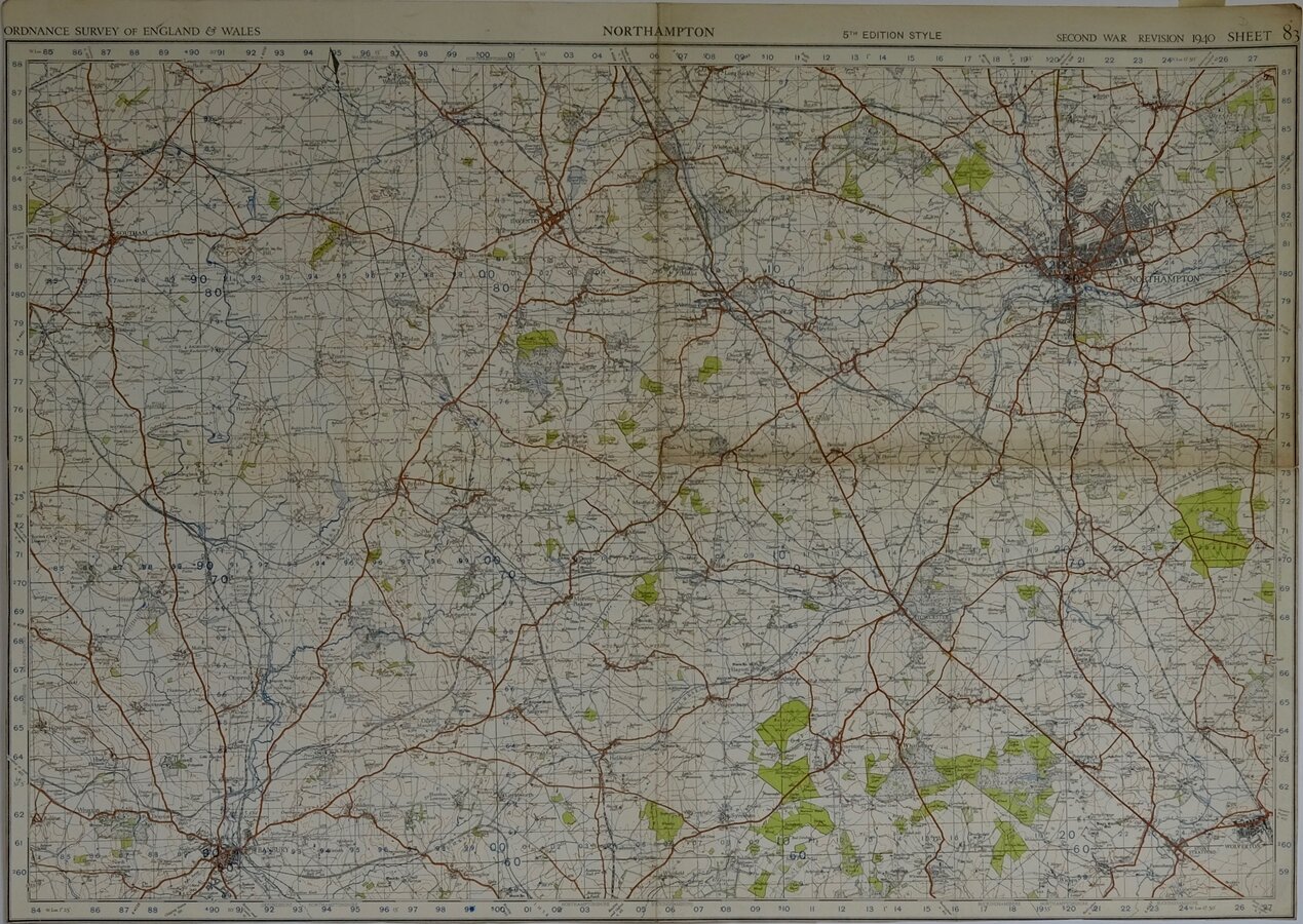 NORTHAMPTONORDNANCE SURVEY OF ENGLAND AND WALES.5TH EDITION STYLESECOND WAR REVISION 1940SHEET 83Paper. Folded. Trimmed to margins