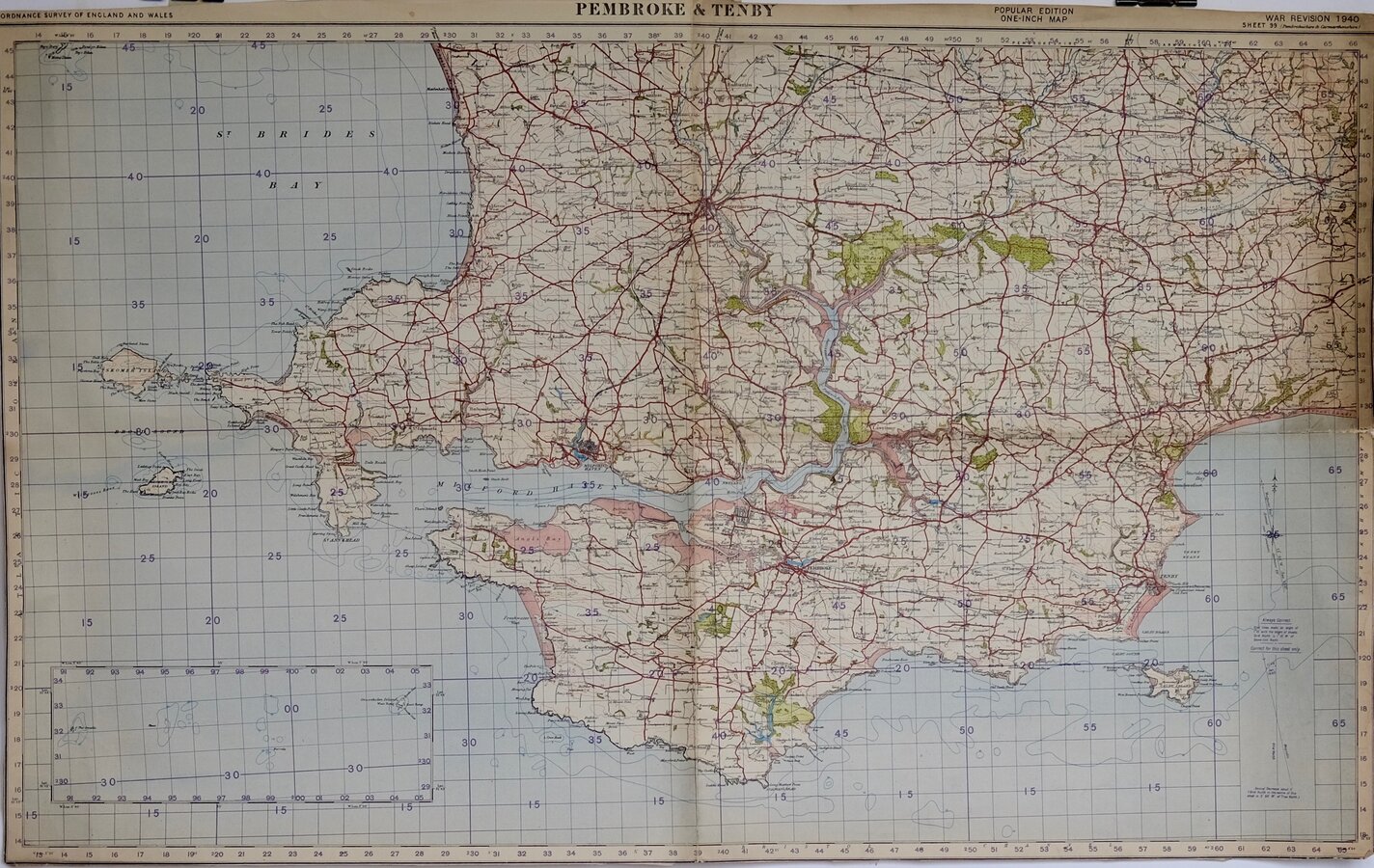 PEMBROKE & TENBY ORDNANCE SURVEY OF ENGLAND AND WALES. POPULAR EDITION ONE-INCH MAP WAR REVISION 1940 SHEET 99 (Pembrokeshire & Carmarthenshire) Linen backed. Folded. Trimmed to margins. Grubby top right.