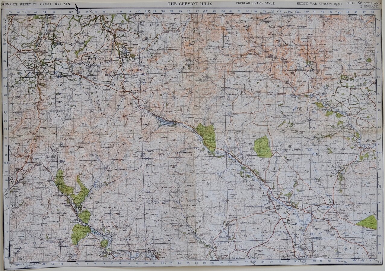THE CHEVIOT HILLS ORDNANCE SURVEY OF GREAT BRITAIN. POPULAR EDITION STYLE SECOND WAR REVISION 1940 SHEEET 86 SCOTLAND ' ' 3 ENGLAND Paper. Folded. Trimmed to margins.