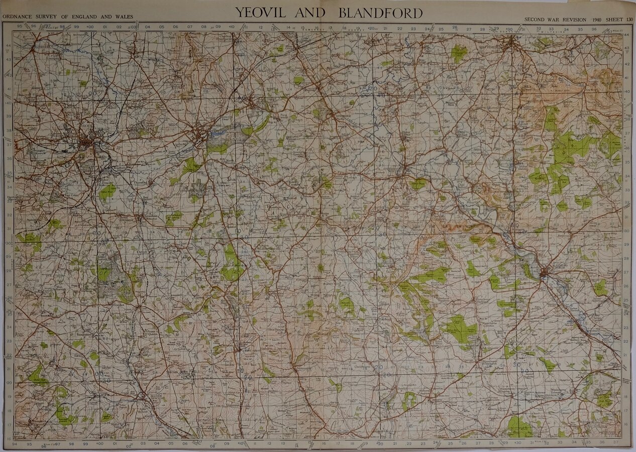 YEOVIL AND BLANFORDORDNANCE SURVEY OF ENGLAND AND WALES.SECOND WAR REVISION 1940SHEET 130 Paper. Folded. Trimmed to margins