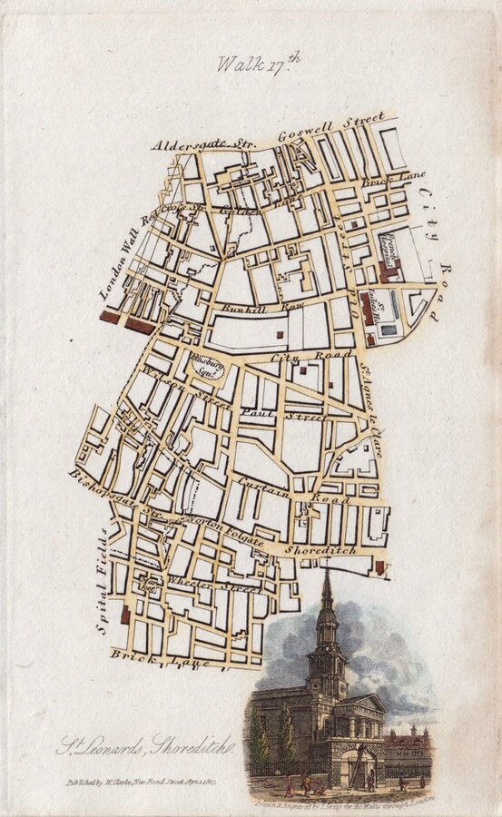 Plan of Barbican and Liverpool street areas from Aldersgate to Brick Lane and City Road to London Wall. No compass point but North is to the right.