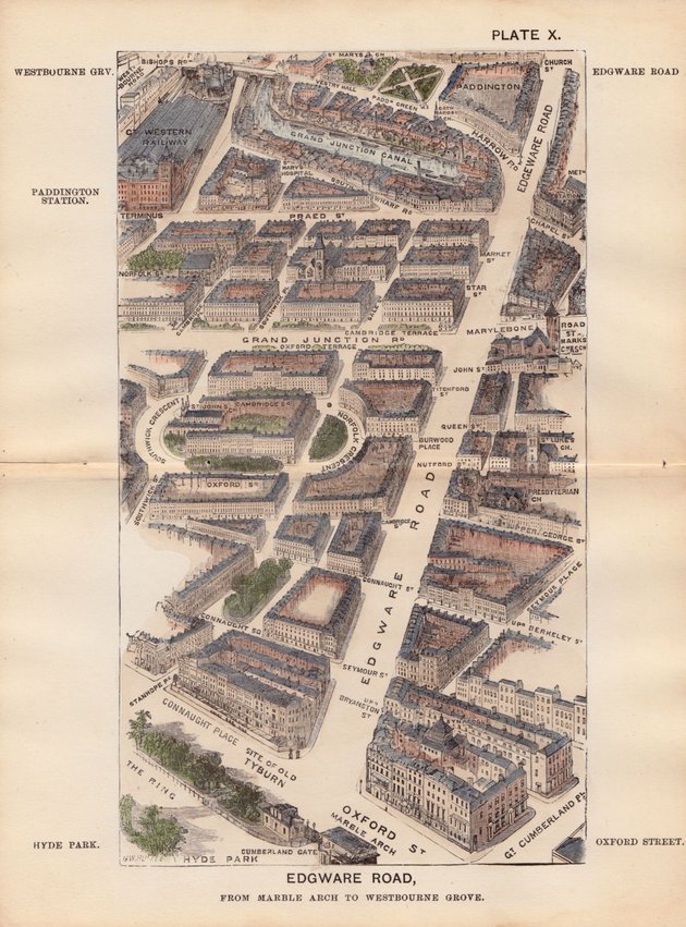 EDGWARE ROAD, | FROM MARBLE ARCH TO WESTBOURNE GROVEBirds Eye view by Herbert Fry. Engraved by G W Ruffle. Hand coloured Lithograph.