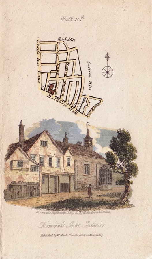 Plan of the area of Hatton Garden from Grays Inn Road to Holborn Hill. Vignette of Furnivals Inn, one of the Inns of Chancery demolished a few years after this engraving in 1818. It stood on the site of Holborn Bars, The Prudential Assurance Building on the north side of Holborn.