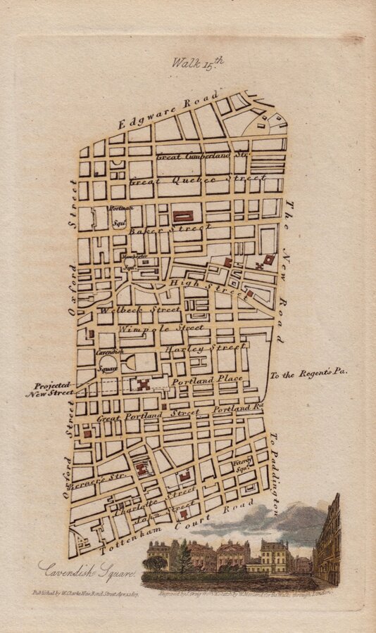 Plan of Marylebone from Edgware Road to Tottenham Court Road and Oxford Street to Marylebone Road. No compass point but North is to the right. Vignette of Cavendish Square (looking North No 11 Cavendish square in the centre).