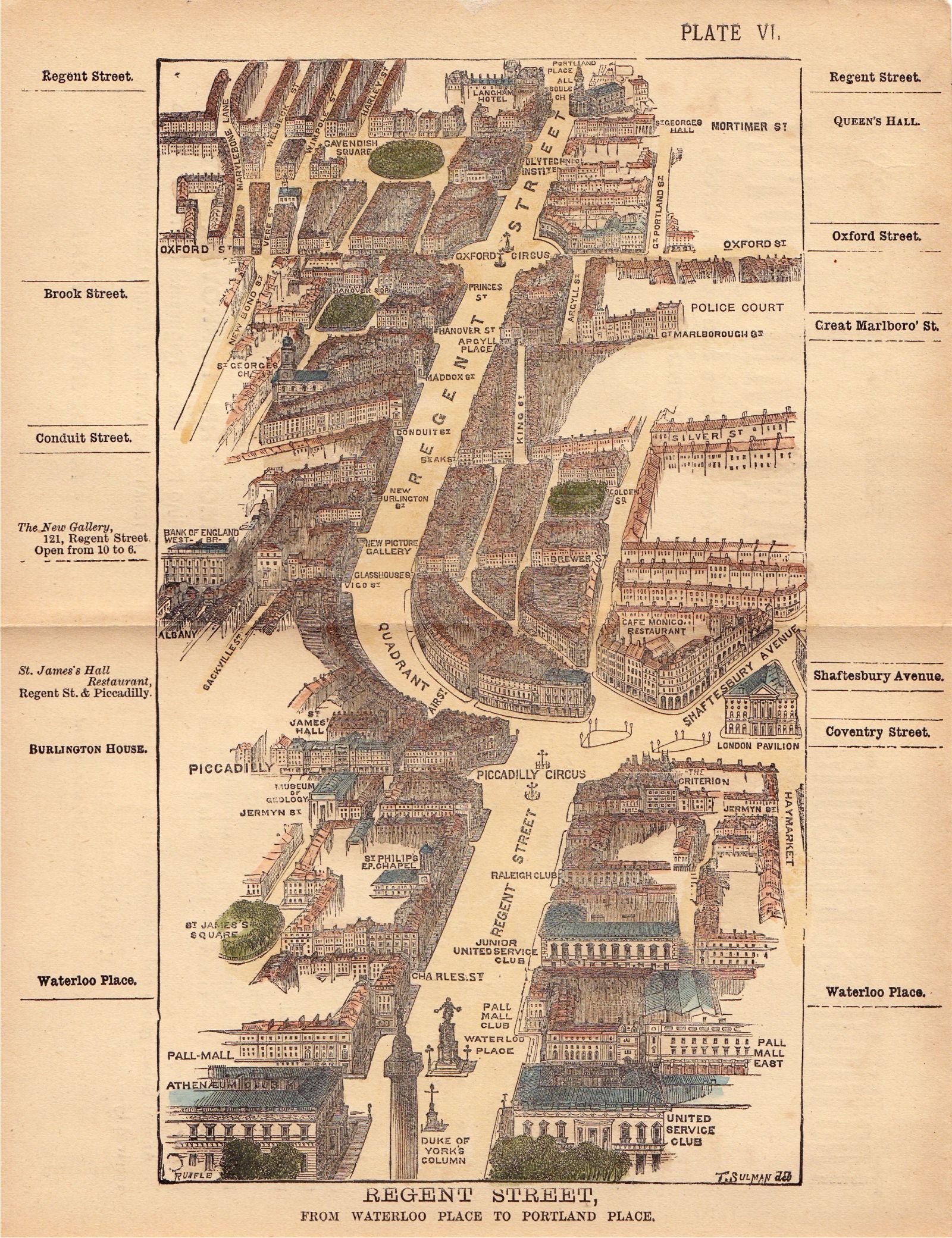From the Atheneum Club and Pall Mall, through Piccadilly Circus and Oxford Circus to Langham Hotel, All Souls Church and Langham Place.Hand coloured lithograph drawn by T. Sulman and published by Herbert Fry.