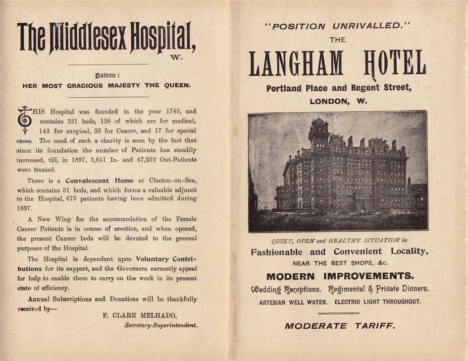 Advertisements for The Middlesex Hospital and Langham Hotel verso.