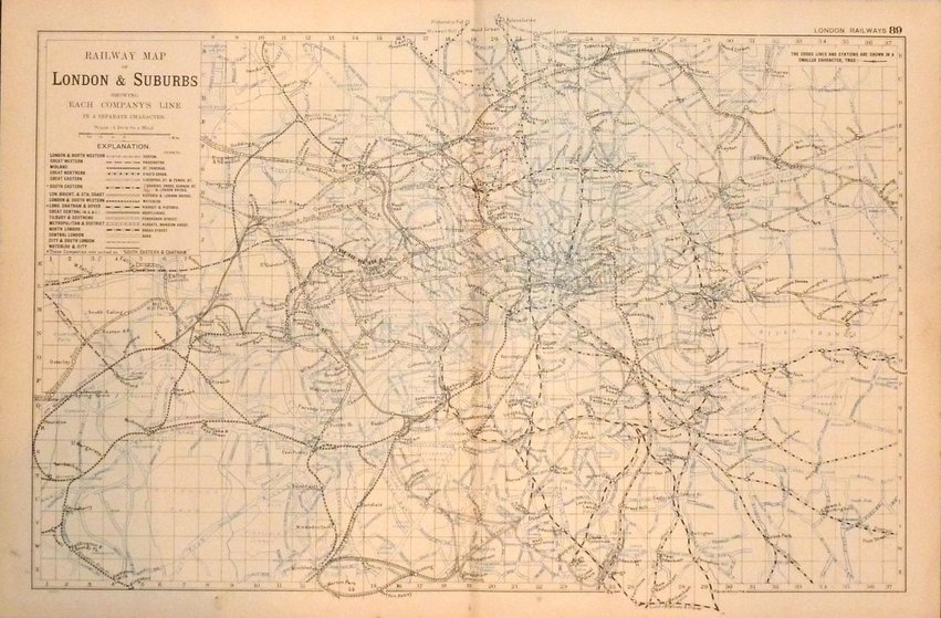RAILWAY MAP | OF | LONDON & SUBURBS | SHOWING | EACH COMPANY'S LINE | IN A SEPARATE CHARACTER. | SCALE - 1 INCH TO A MILE