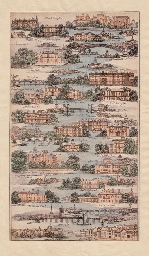 This map depicts the route of the Thames from Lambeth Palace to Eton and Windsor. The map is trimmed to margin and pasted on old paper but it remains an attractive, detailed and scarce map in original hand colour.