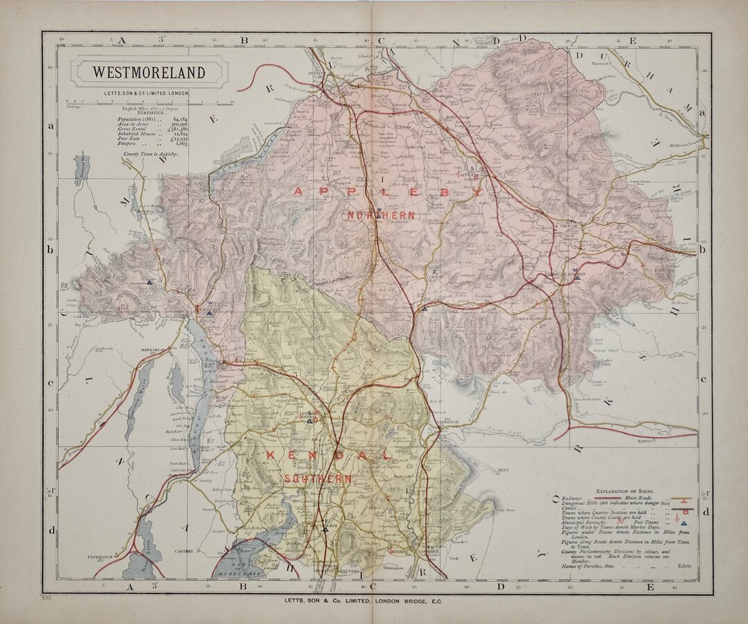 This example of the map of Westmorland is the final issue. Printed by lithographic transfer overprinted with colours, it was published by Letts, Son & Co. in Lett’s Popular County Atlas… in 1887. The lines of graticule across the map with reference numbers in the margin and the printer’s reference X85, which represents the printing date of October 1885, outside border bottom left identify this edition.