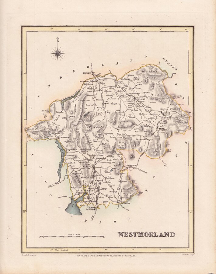 Copper engraving by the firm of J & C Walker from a drawing by Roger Creighton for publication in A Topographical dictionary of England… published by Samuel Lewis and Co. from 1831. The work achieved considerable success and was re-issued many times by Lewis until 1849. During this time the maps were amended and updated to include electoral information and the rapidly expanding railway network, with most counties known in at least six different states.