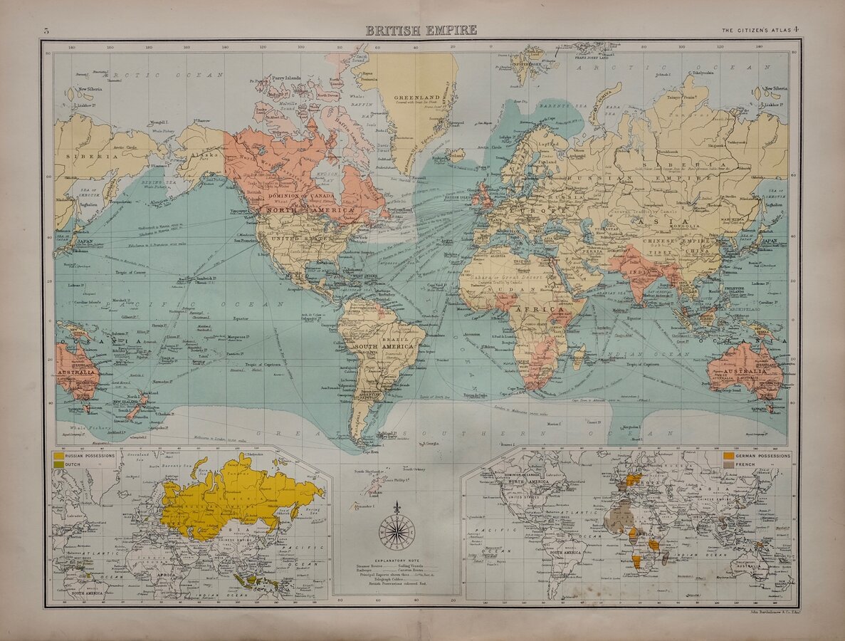 Colour lithograph printed map by John George Bartholomew (1860-1920), geographer and cartographer to King George V. and successor to the famous mapmaking and engraving business founded by his great-grandfather George Bartholomew (1784-1871). Published in Bartholomew's Citizen's Atlas of the World...George Newnes, London 1898.