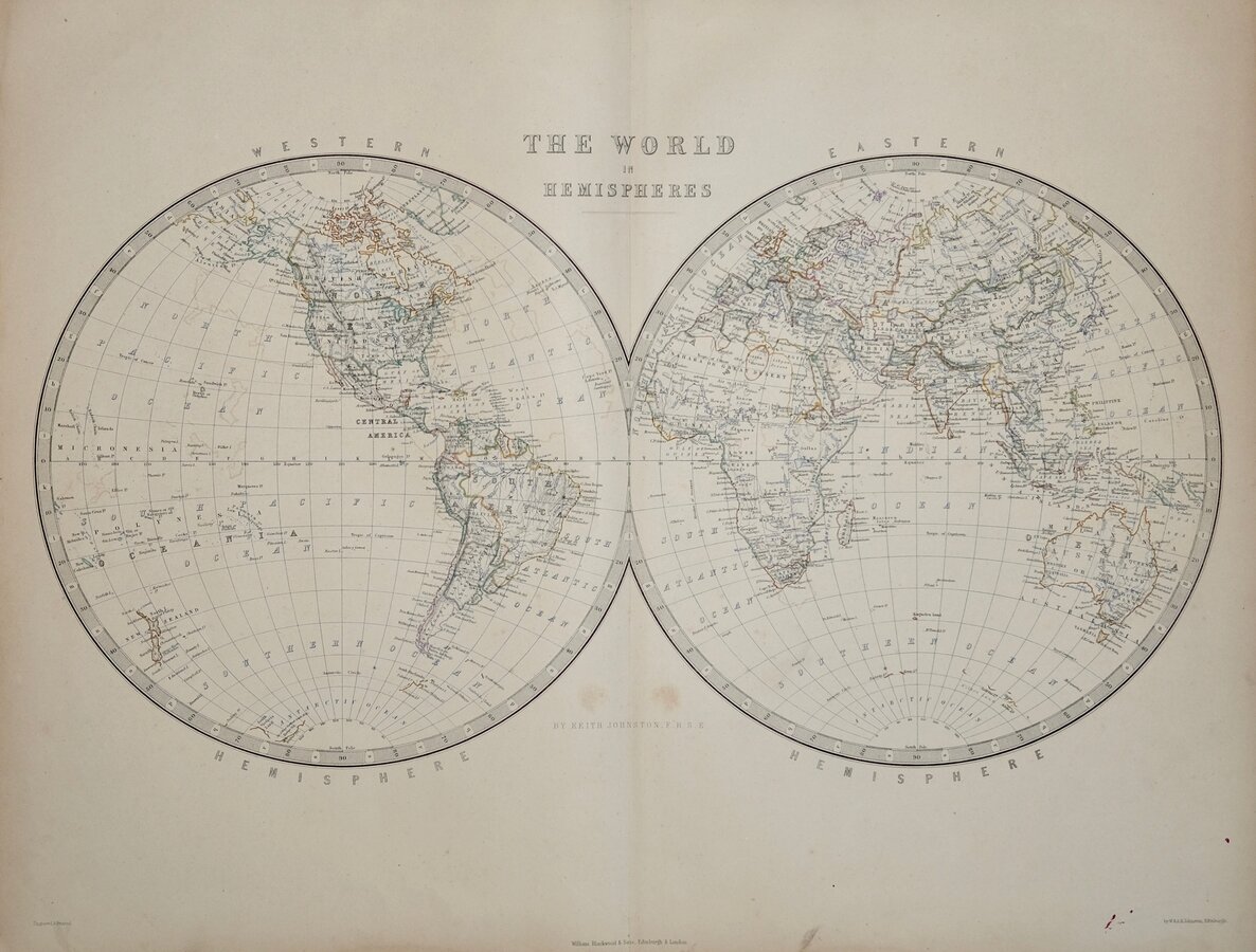 Short split at bottom centrefold affecting the Blackwood imprint, some browning to paper edges, a couple of spots above the Keith Johnston signature between the hemispheres and light off-setting from the original hand colour. It remains an attractive and presentable map.