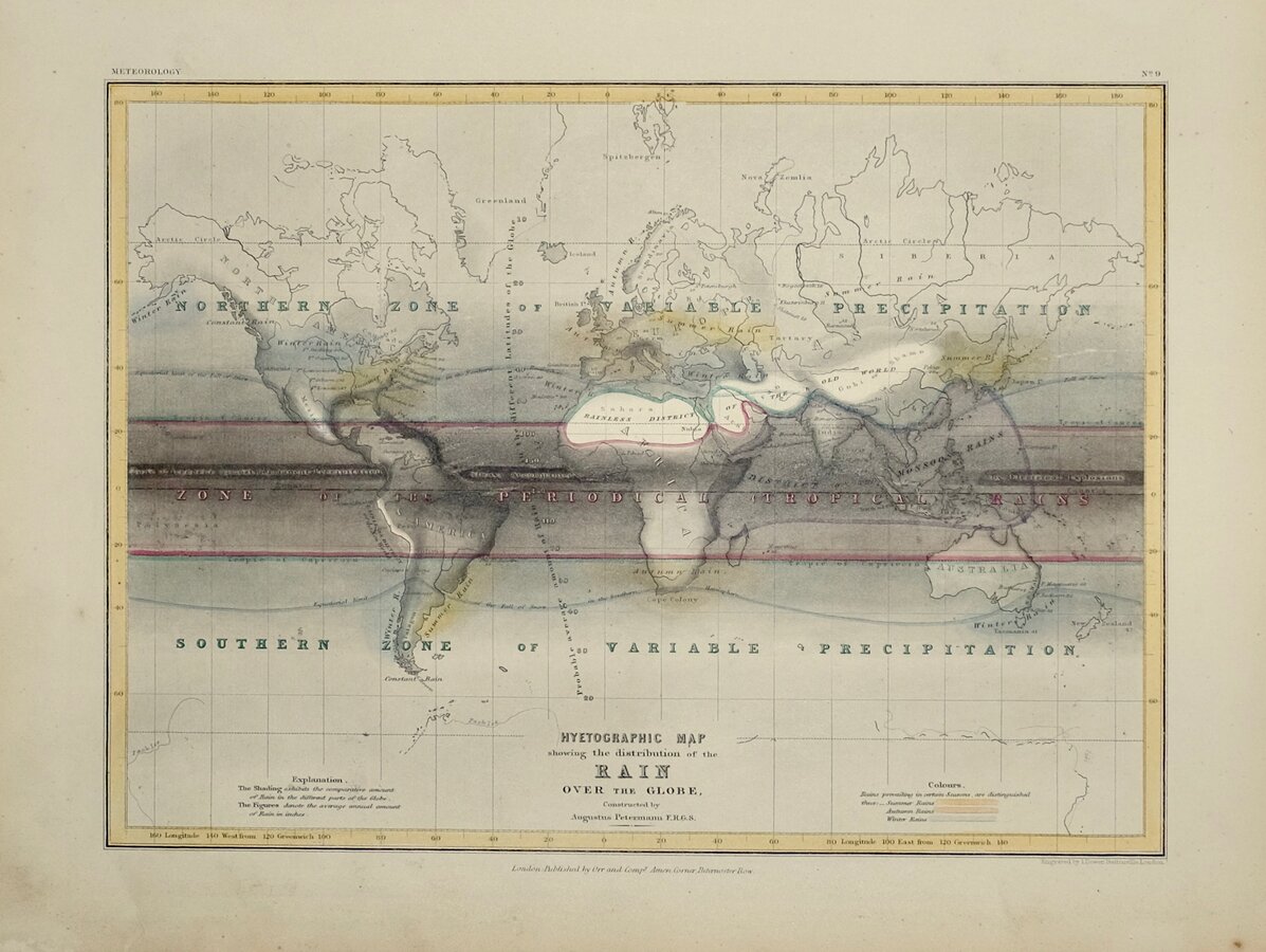 The map indicates by shding the comparative rainfall acrosss the globe with figures after the major towns and cities indicating the average annual rainfall in inches. Hand colouring highlights the various zones and seasons of rainfall.