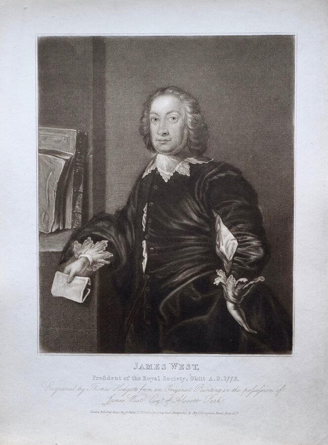 James West (1703-1772), British politician and antiquary. President of the Royal Society 1768-1772. Elected MP for St. Albans, Hertfordshire in 1741 and member for Boroughbridge, Yorkshire from 1768 to 1772.