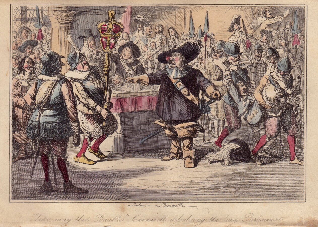 "Take away that Bauble" Cromwell dissolving the long Parliament. Etching by John Leech (1817-1864) published in The Comic History of England by Gilbert Abbott A'Beckett...The Punch Office, London 1847-48. Original hand colour. Supplied in 28x24cm. cream acid-free mount and conservation barrier board ready for framing. Image size: 17x12cm.